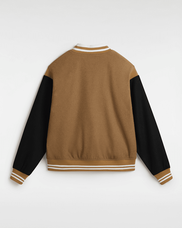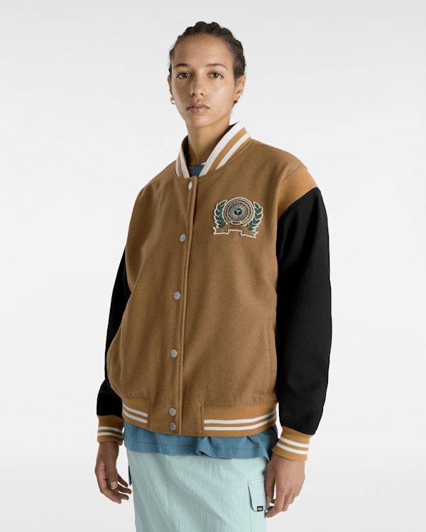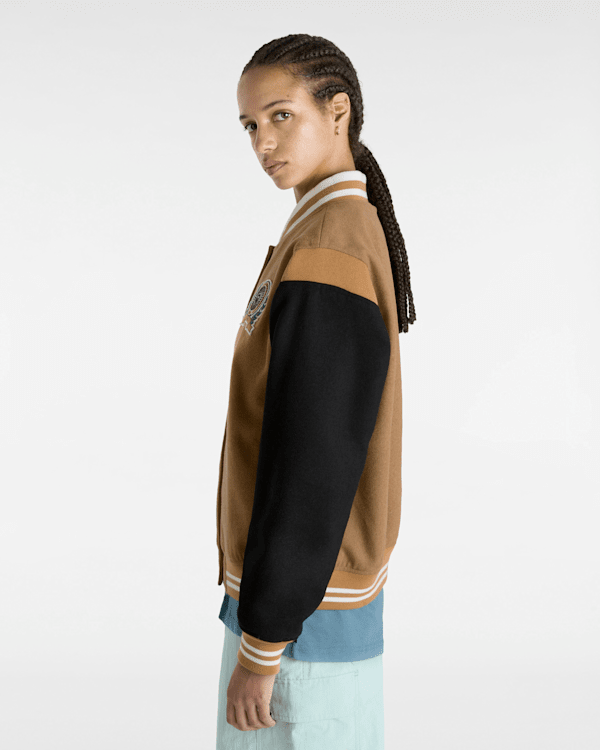 La chaqueta Piper Stadium es una prenda totalmente forrada de estilo universitario que presenta un diseño en tonos marrones en contraste y luce un ribete en jacquard y un parche de felpilla en la parte delantera.