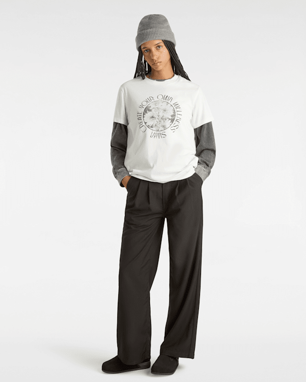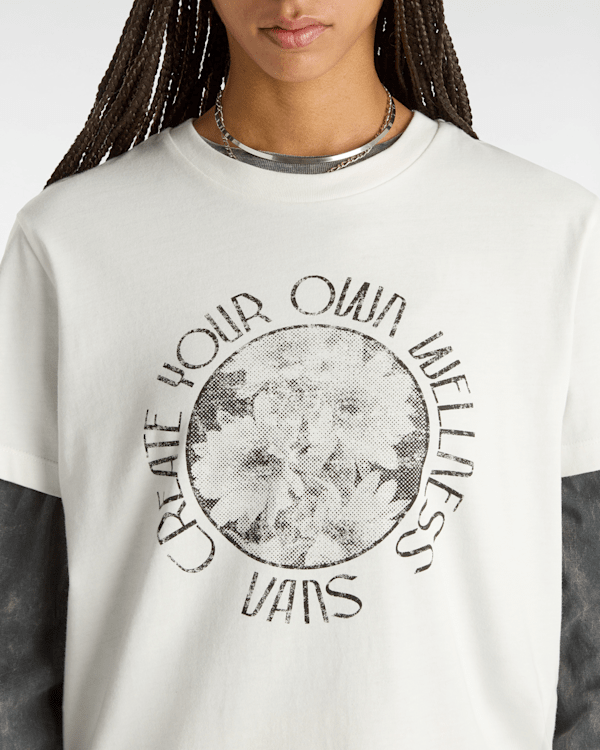 La camiseta de corte boyfriend Wellness es un modelo de manga corta y cuello redondo, decorado con el logotipo de Vans, así como varios motivos florales, en la parte delantera