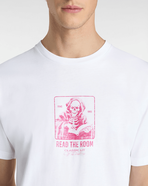Renueva tu estilo con la camiseta Read the Room, un diseño clásico de manga corta y cuello redondo con un gráfico serigrafiado de un esqueleto que lee un libro en medio del logotipo de Vans®