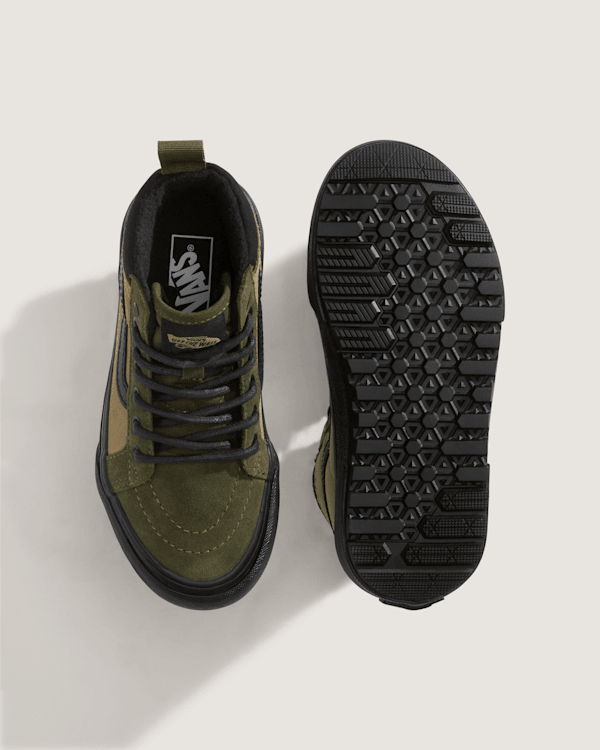 Las MTE Sk8-Hi para niños toman como base uno de los modelos más clásicos y emblemáticos de la marca, las Sk8-Hi, y lo renuevan mediante la incorporación de unas palas impermeables de ante, un paquete de aislamiento térmico Primaloft y una suela diseñada para aumentar la tracción.