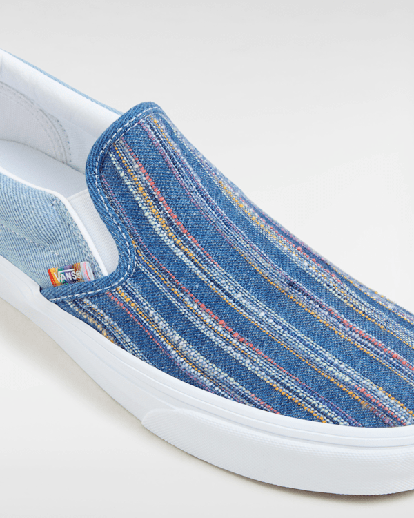 Collection Vans Pride Chaussures Slip-On emblématiques Tige basse en denim Broderie rayée colorée Col rembourré pour plus de maintien Finitions élastiques sur les côtés Semelle extérieure gaufrée emblématiqu