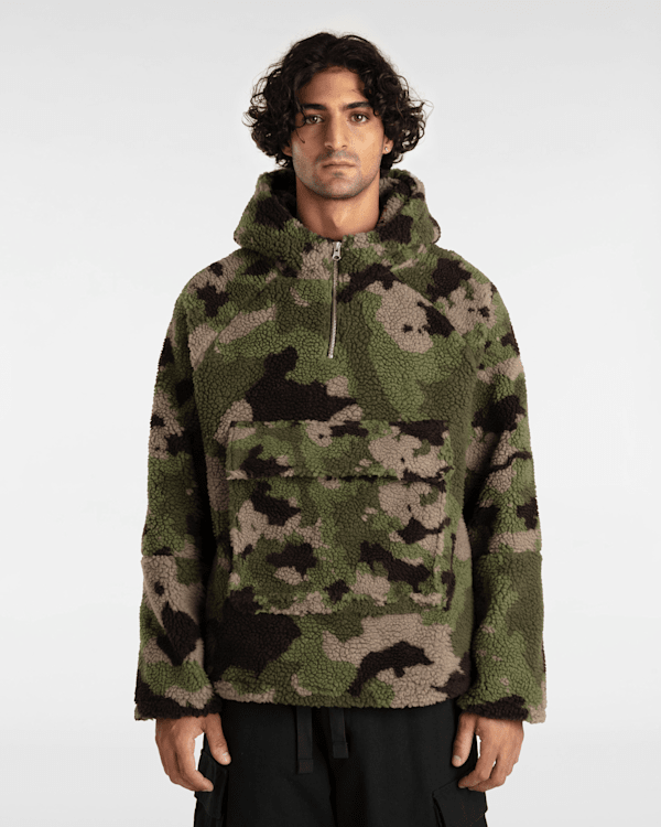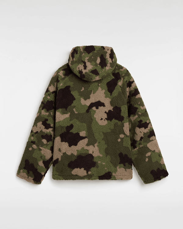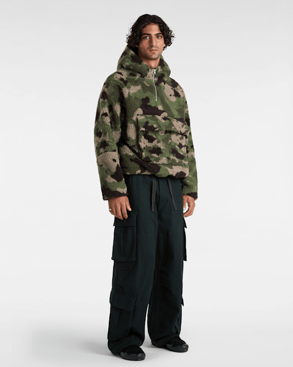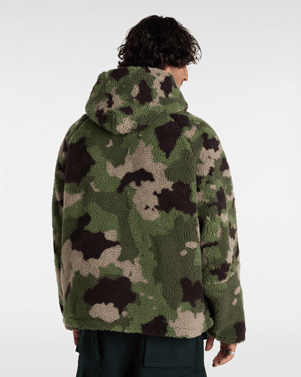 Le sweat à capuche Premium Oversized Sherpa de Vans est doté de manches longues, d'une poche kangourou à boutons-pression dissimulés, d'une fermeture zippée au col et d'un cordon de serrage à la taille pour l'ajuster.