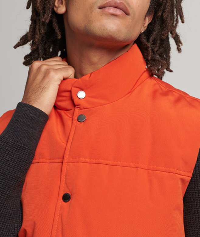 Kies je gebruikelijke maat Gewatteerd ontwerp Mouwloos Drukknoopsluiting Twee zakken met drukknopen Volledig gevoerd Leren label Gerecyclede vulling Kenmerkende Superdry-patch De wattering in deze jas is gemaakt van 100% gerecycled materiaal.