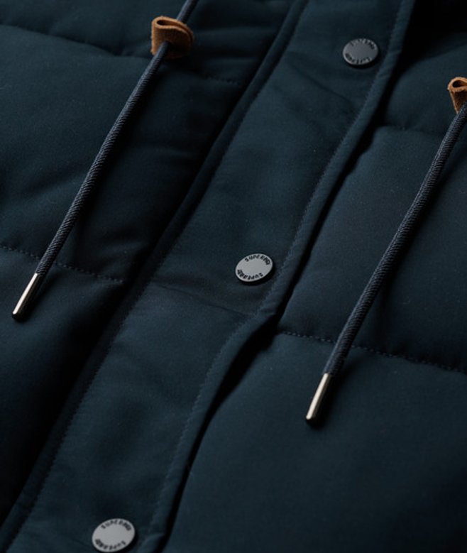 Slimfit - de nauw aansluitende pasvorm zorgt voor een strakkere look Volledig gewatteerd ontwerp Capuchon met verstelbaar trekkoord en leren koordstoppers Verwijderbare rand van imitatiebont Rits- en drukknoopsluiting Twee voorzakken met rits en leren trekkers De wattering in deze bodywarmer is gemaakt van 100% gerecycled materiaal.