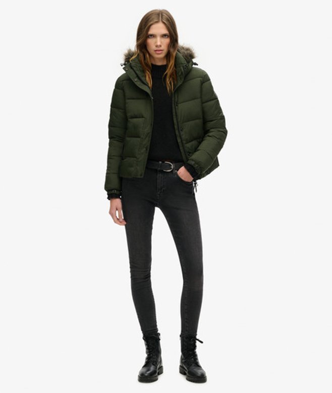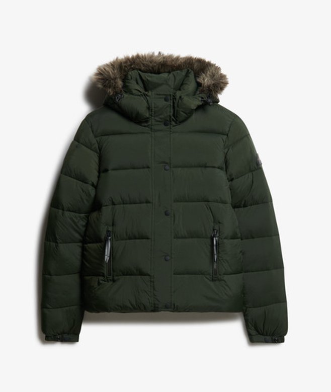 Slimfit - de nauw aansluitende pasvorm zorgt voor een strakkere look Tweewegritssluiting met drukknopen Capuchon met trekkoord Twee zakken met rits Elastische manchetten met drukknopen Superdry-logopatch De vulling in deze jas is gemaakt van tot 100% gerecyclede materialen.