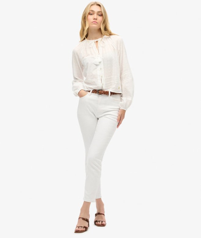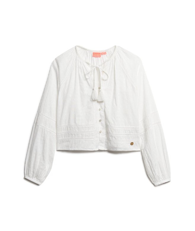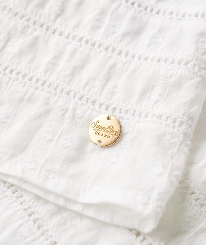 Losse pasvorm - cool en comfortabel komen samen in een stijlvolle losse pasvorm die je gewoon moet hebben Broderie-details Kanten inzetstukken Kraag met trekkoord en kwastjes Knoopsluiting Raglanmouwen Manchetten met knopen Metalen Superdry-label