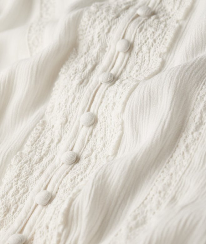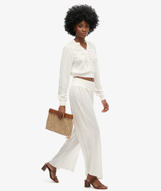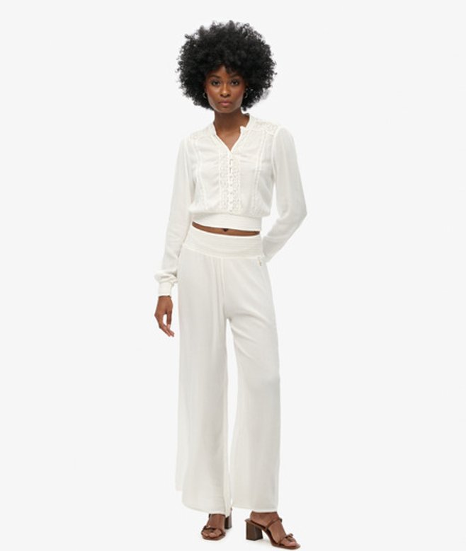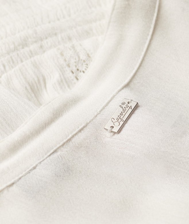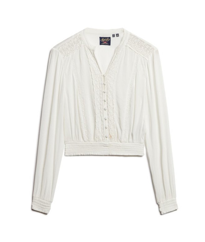 Superdry Blouse met Lange Mouwen, Smokwerk en Kanten Randen Crème