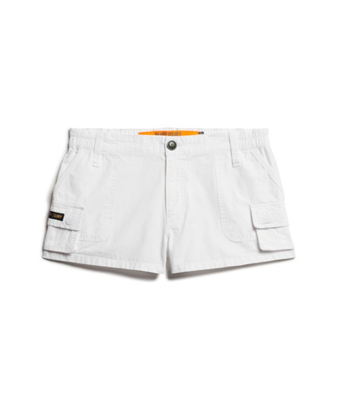 Kies je gebruikelijke maat Halfhoge taille Elastische tailleband Riemlussen Knoop- en ritssluiting Twee zijzakken Twee cargo-zijzakken Twee achterzakken Superdry-patch