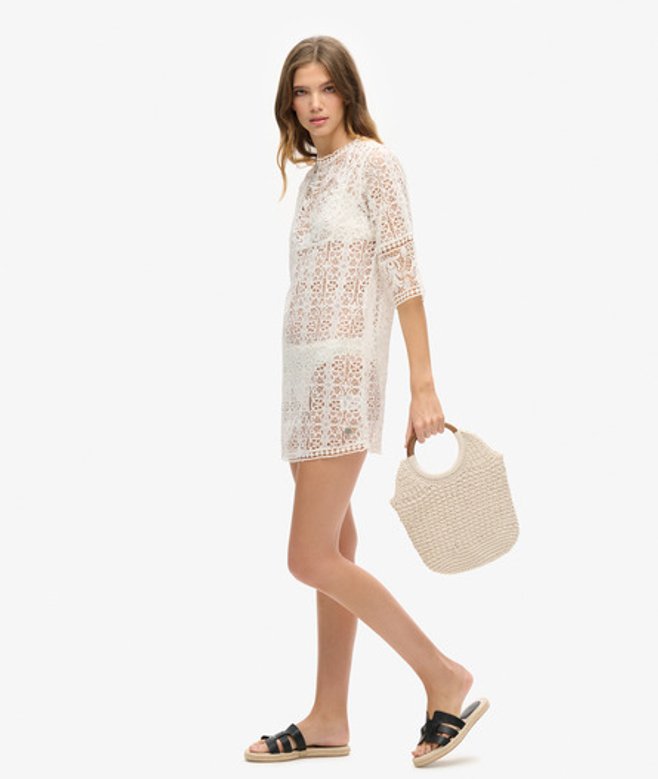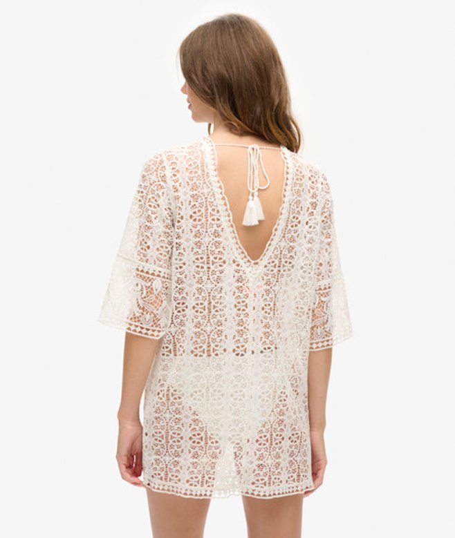 Superdry Beach Cover Up Mini-jurk met Kanten Details Crème
