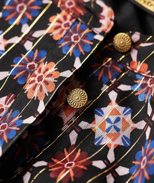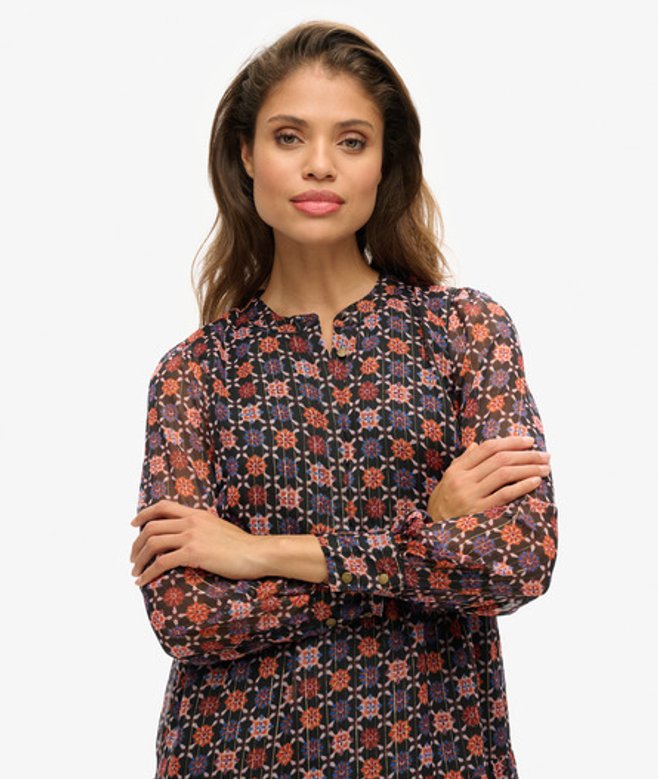 Losse pasvorm - cool en comfortabel komen samen in een stijlvolle losse pasvorm die je gewoon moet hebben Ronde hals Verborgen knoopsluiting Gedetailleerde metalen knopen Lange mouwen van mesh Gelaagde plooirok Manchetten met knopen Volledig gevoerd