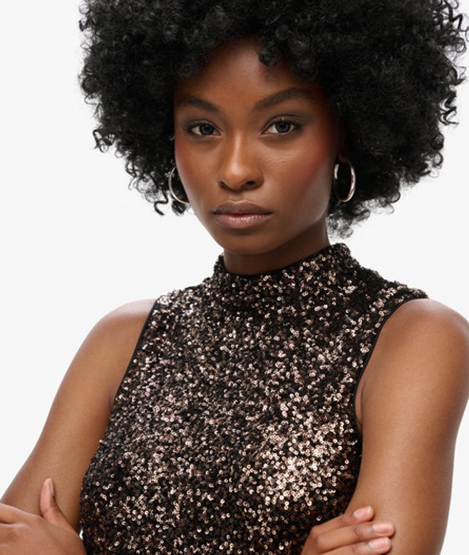 We hebben klassieke silhouetten uit de jaren 60 opnieuw ontworpen en verwerkt in onze mouwloze jurk met lovertjes en A-lijn.