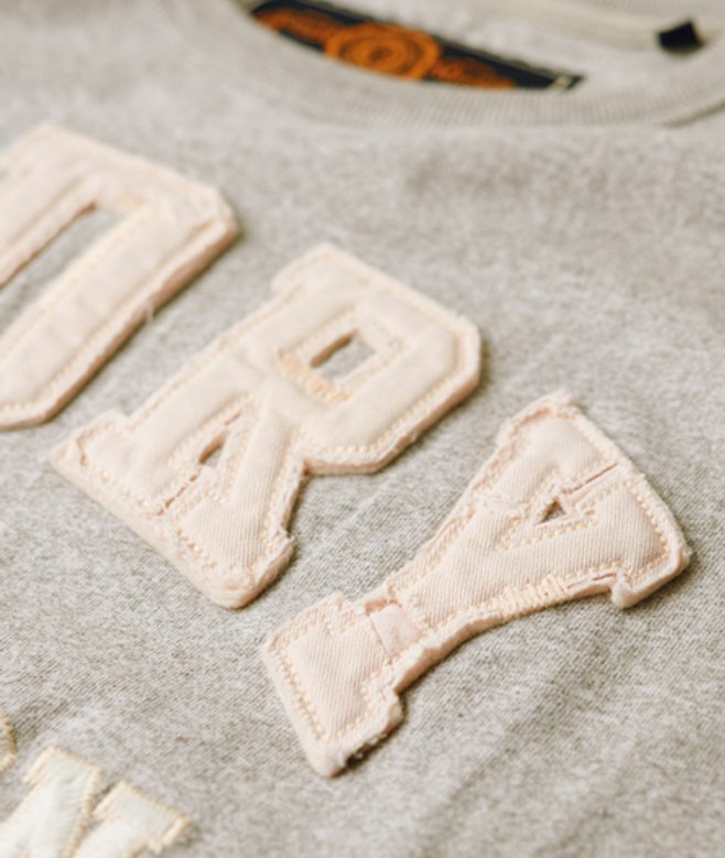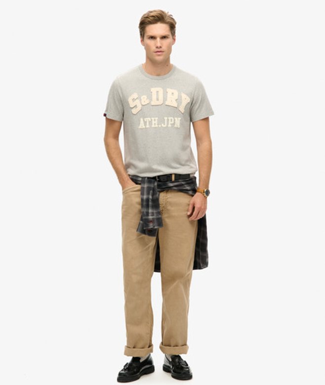 Kies je gebruikelijke maat Ronde hals Korte mouwen Superdry-patch Een crèmekleurige 'S & DRY'-appliqué van verweerd vilt, met een geborduurde 'ATH JPN' eronder.