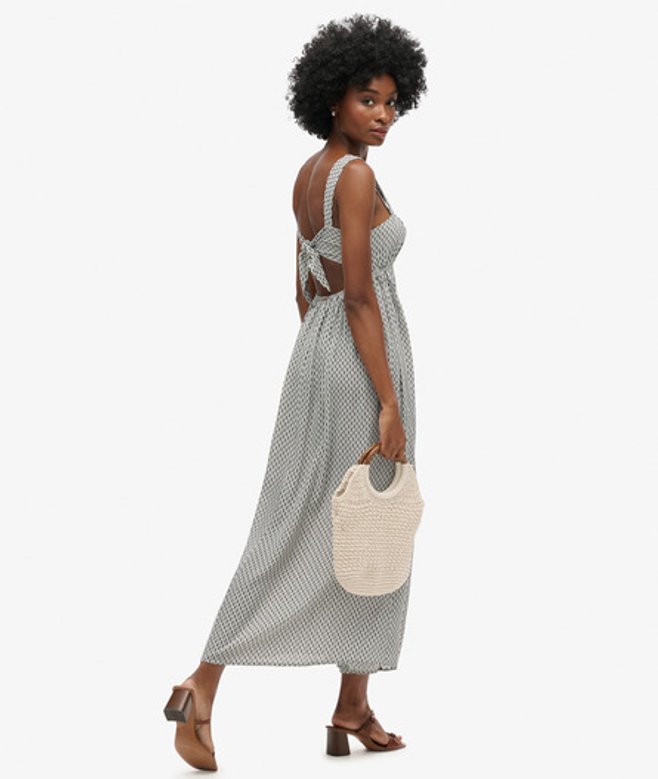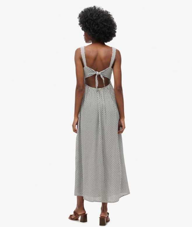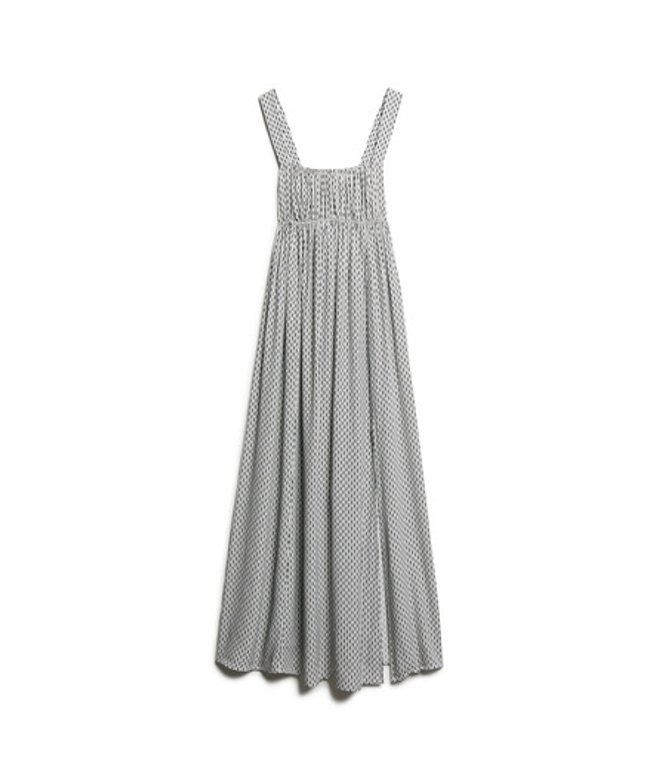Kies je gebruikelijke maat Mouwloos met brede bandjes Rechte halslijn Elastische halslijn en taille Lang ontwerp Split aan één been Geknoopte open achterkant Metalen Superdry-label