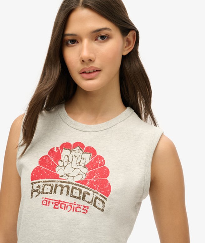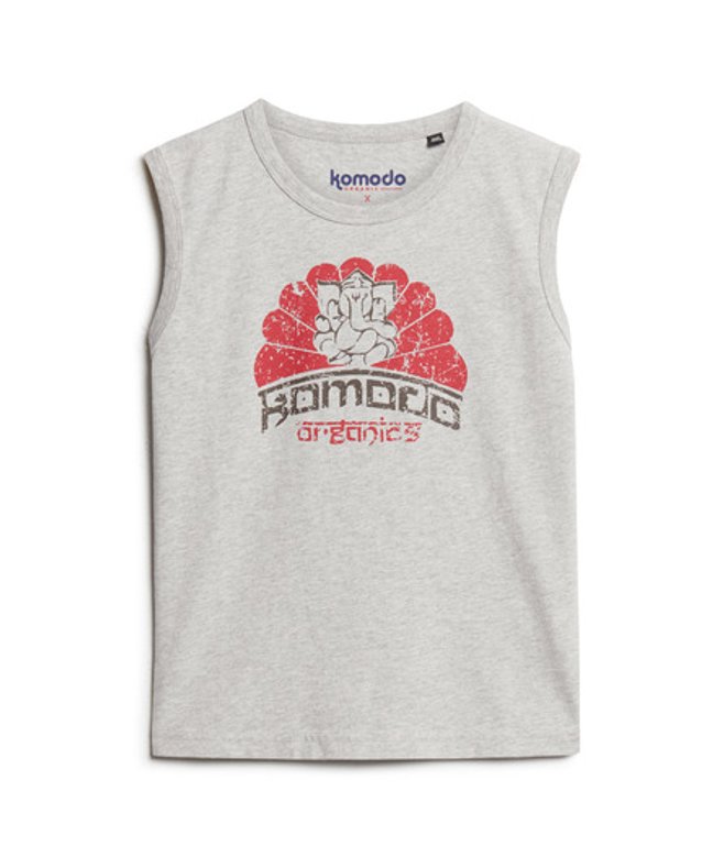 Slimfit - de nauw aansluitende pasvorm zorgt voor een getailleerd silhouet Middelzware geborstelde jersey Mouwloos ontwerp met een ronde hals voor een klassiek tanktopmodel Graphic met vintage effect Geef een originele touch aan je kledingcollectie met de Superdry x Komodo Ganesh Slim-hemdtop.