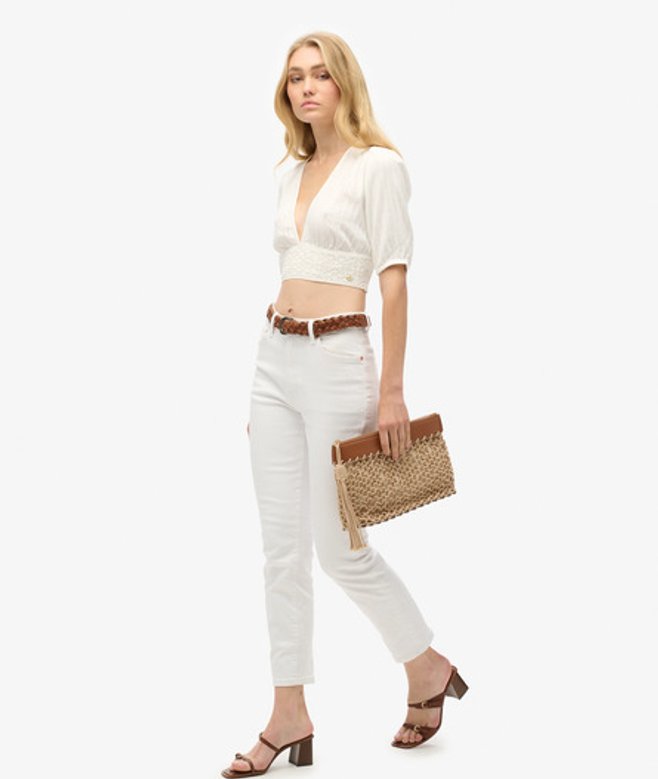 Slimfit - de nauw aansluitende pasvorm zorgt voor een getailleerd silhouet Diepe V-hals Elastische pofmouwen Kanten afwerking op de taille Inzetstuk met smokwerk op de rug Kleine Superdry-badge