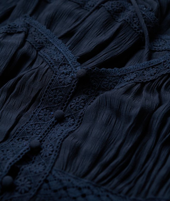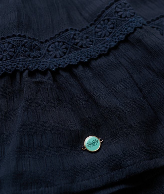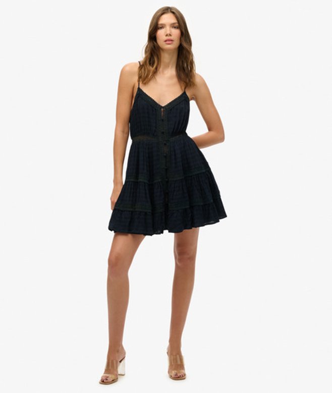 Losse pasvorm - cool en comfortabel komen samen in een stijlvolle losse pasvorm die je gewoon moet hebben Stof met textuur Knoopsluiting Spaghettibandjes Gevoerde rok Kanten details Metalen Superdry-knoop