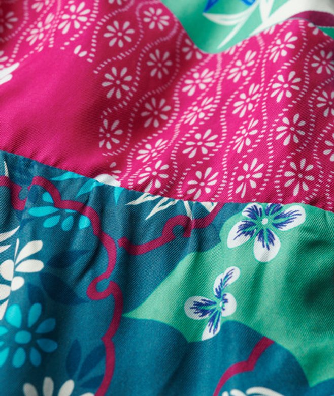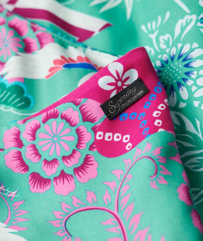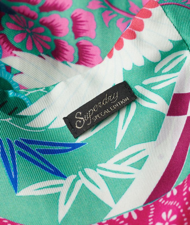 Kies je gebruikelijke maat Verstelbare spaghettibandjes V-hals Ritssluiting aan de zijkant Twee zakken op de taille Wijde pijpen Opening aan de achterkant met gekruiste bandjes Superdry-patch
