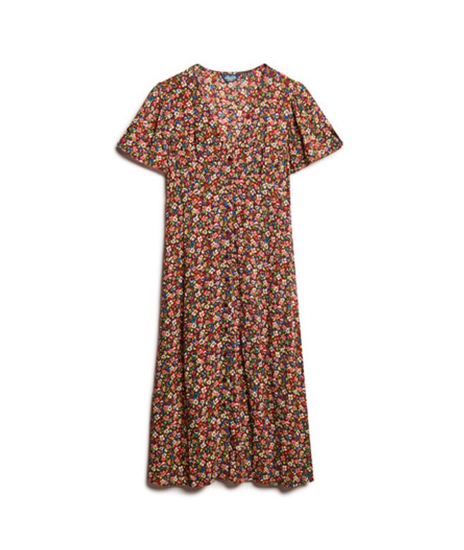 Door de flatterende pasvorm en het lichtgewicht materiaal is de bedrukte midi-teadress met knopen en korte mouwen een ideaal basisitem voor je garderobe.
