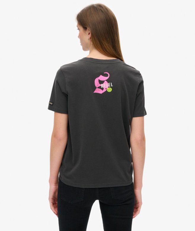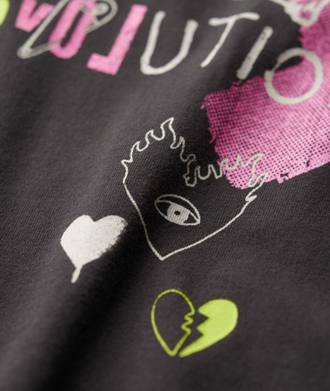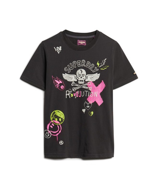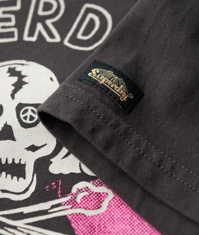 Kies je gebruikelijke maat Klassiek T-shirt met ronde hals Korte mouwen Licht verweerde hals en zoom Op punk geïnspireerde grafische print Logolabel op mouw Verweerde plekken