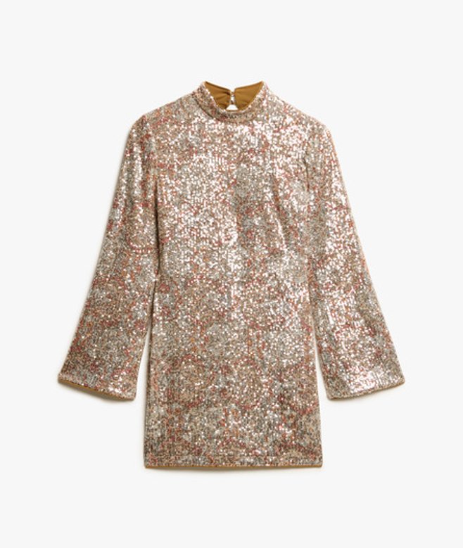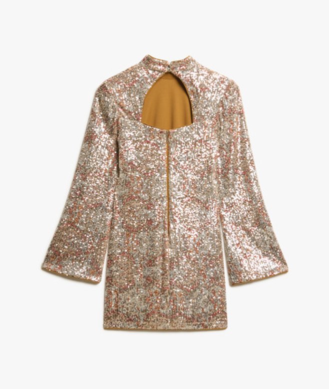 Verdwaal dit seizoen nooit meer op de dansvloer met onze mini-jurk met print, pailletten en lange mouwen.