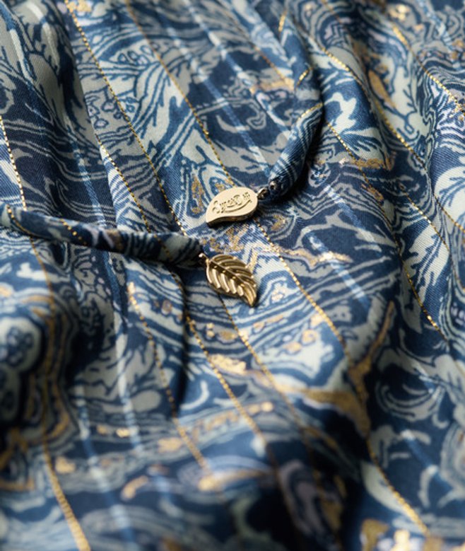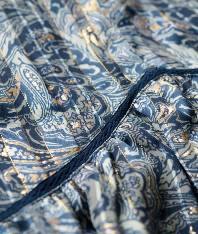 De kanten details en de fijne metallic strepen stralen luxe uit en creëren een look die ideaal is voor overdag en in de avond.