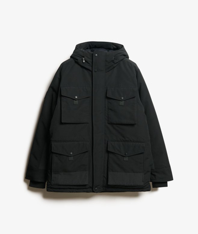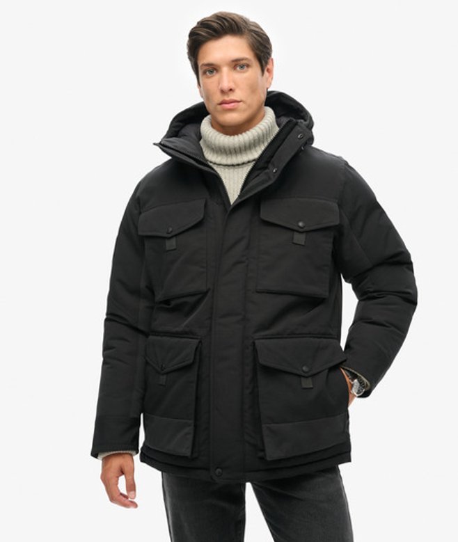 De parka is ontworpen met zes zakken aan de buitenkant en een stevige wattering.