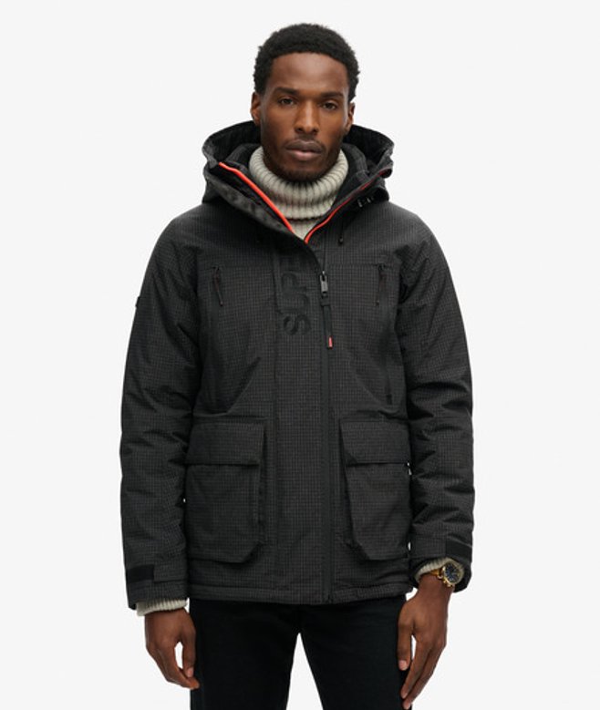 Losse pasvorm - de stijlvolle losse pasvorm maakt dit tot een must-have waarin comfortabel en cool samenkomen Verstelbare capuchon met elastisch koord Geribde kraag Dubbellaagse tweewegritssluiting Met klittenband verstelbare manchetten Twee borstzakken met rits Twee zakken met drukknoopsluiting Elastisch trekkoord in de zoom Geborduurd Superdry-logo Superdry-label op de mouw en achterkant