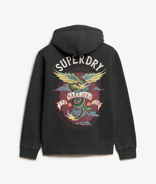 Kies je gebruikelijke maat Klassiek ontwerp voor over het hoofd Gevoerde capuchon met verstelbaar trekkoord Buidelzak aan de voorkant Geribde boorden en zoom Op tattoo-cultuur geïnspireerde grafische print Gebarsten Superdry-prints De full-size print op de achterkant toont een gevleugelde draak die door de wolken vliegt, compleet met een spandoek met een Japans motief in zijn klauwen.