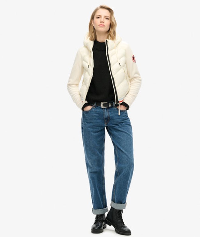 Kies je gebruikelijke maat Hybride jas met stoffen in meerder texturen Gevoerde en gewatteerde capuchon met trekkoordverstelling Ritssluiting Twee buitenzakken met ritsen Chevron gewatteerd inzetstuk aan de voorkant Achterkant en mouwen van corduroy Manchetten met duimgaten Driekleurige geribbelde boord Gewatteerde binnenkraag Binnenzak van mesh Logolabel op de mouw Geborduurd logo op de kraag