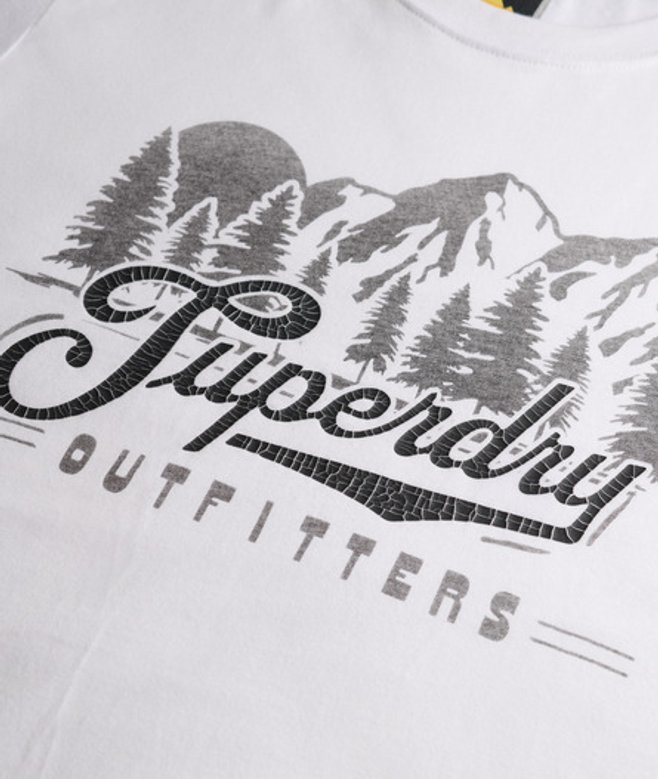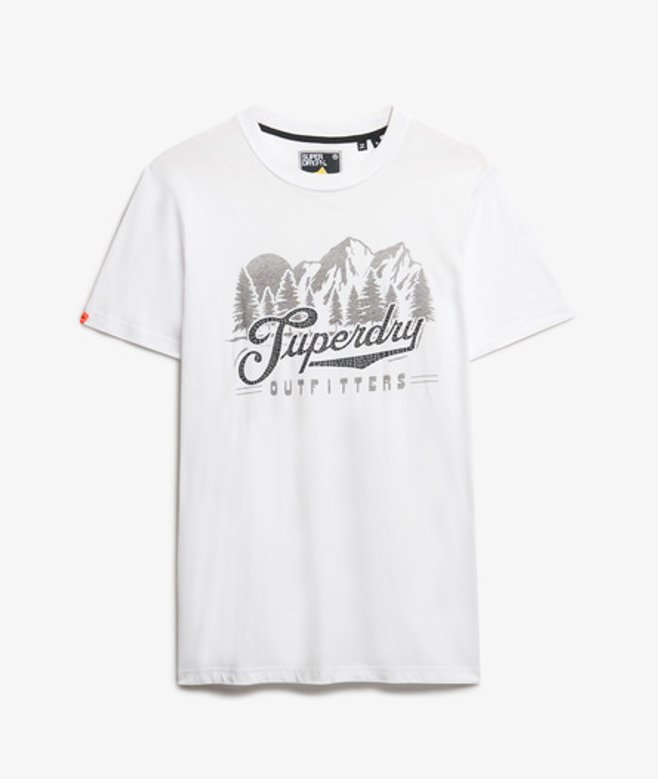 Kies je gebruikelijke maat Ronde hals en korte mouwen Getextureerd logo en grafische opdruk op de borst Kenmerkend logolabel op de mouw Geef je casual collectie een speelse flair met het Outfitters-T-shirt.