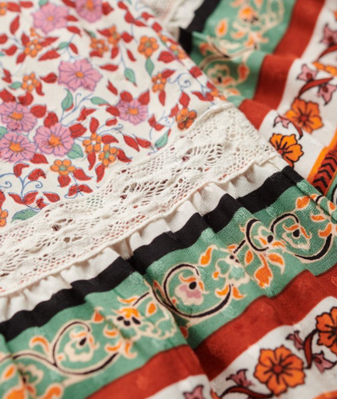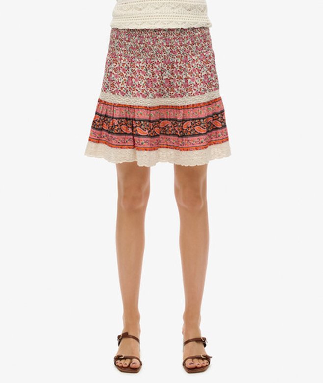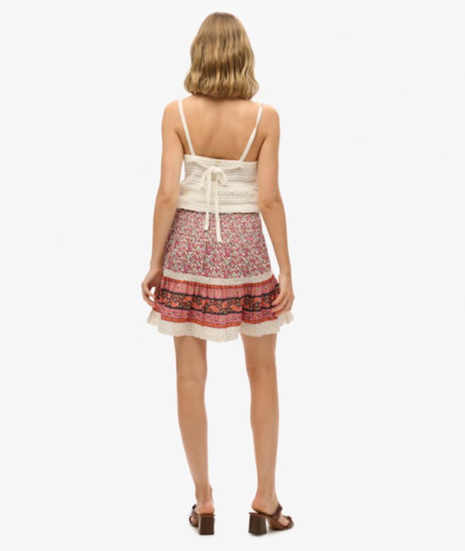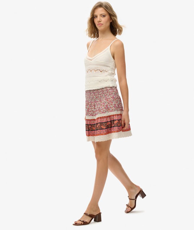 Deze rok met zijn bohemien ontwerp en patroon in combinatie met verfijnde kanten details, is de perfecte rok die elke look versterkt en je op je allermooist laat voelen.