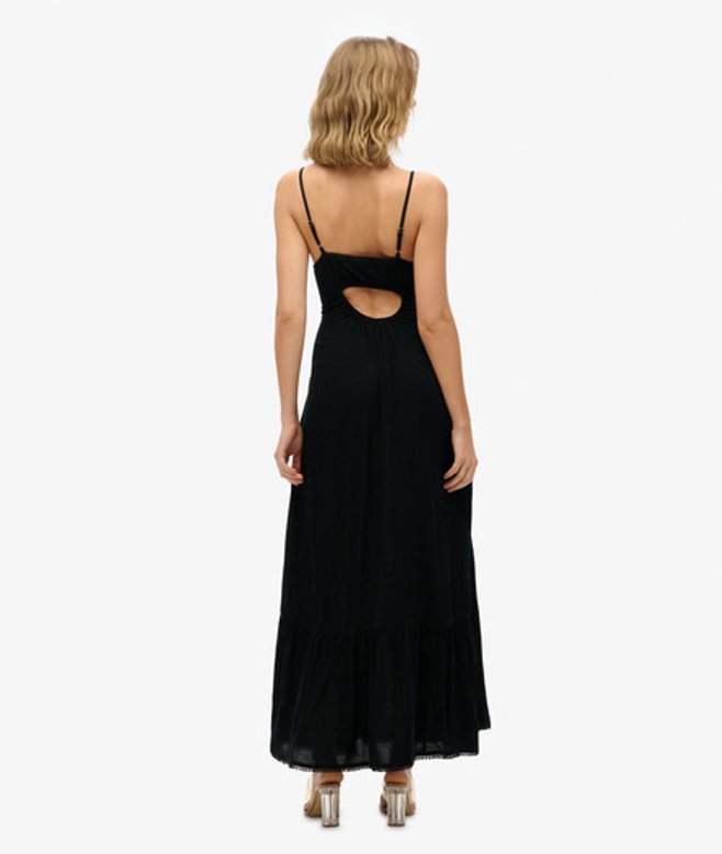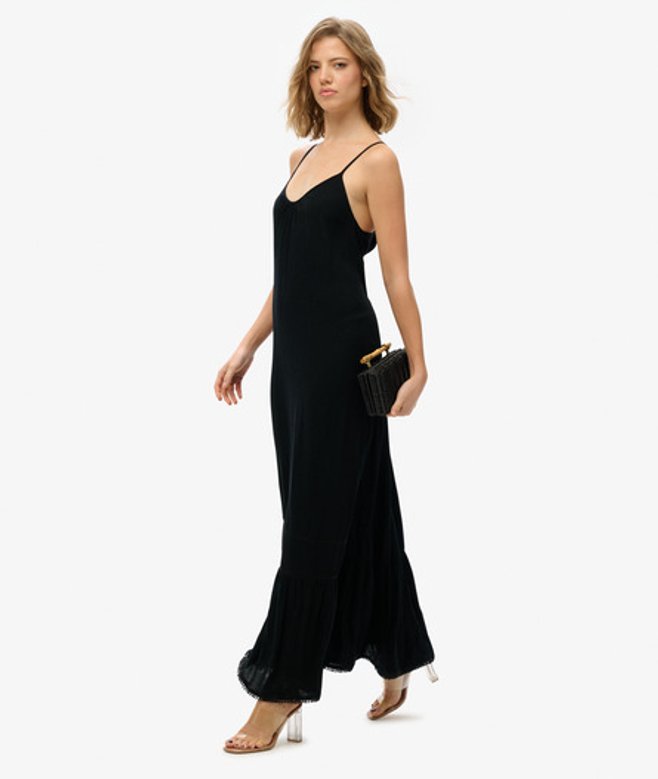Losse pasvorm - de stijlvolle losse pasvorm maakt dit tot een must-have waarin comfortabel en cool samenkomen Verstelbare spaghettibandjes en een V-halslijn Maxilengte met een strokenrok en kanten randen Uitgesneden achterkant De cami maxi-jurk ontworpen voor zonovergoten dagen waarop je elegant voor de dag wilt komen.