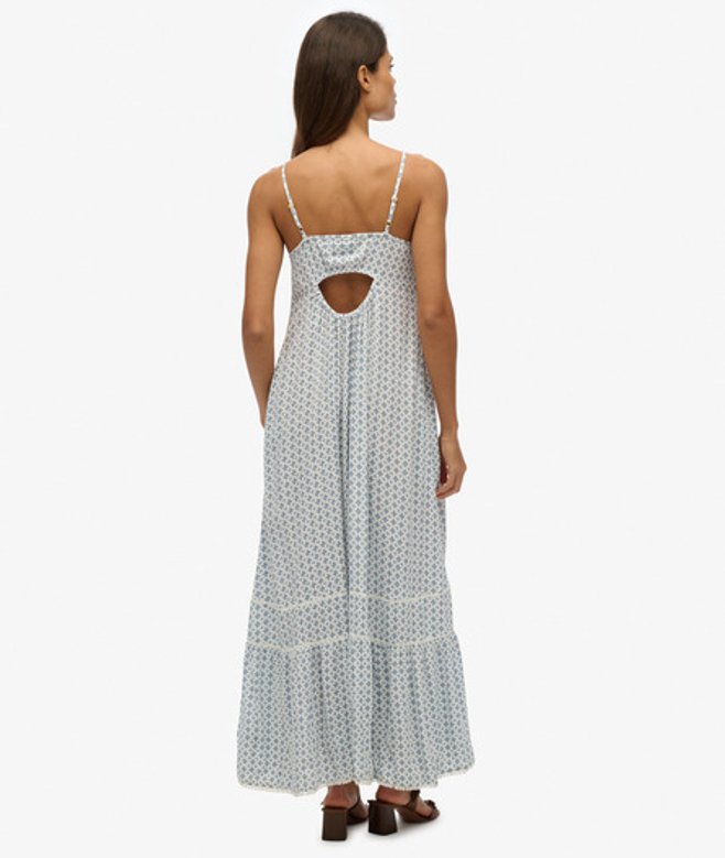 Loose Fit - where comfort meets cool, a stylish loose cut makes this a must-have shape Adjustable spaghetti straps and a v-neckline Maxi length with a tiered skirt and lace trims Back cut-out Designed for those sun-kissed days when elegance is the aim, the Cami Maxi Dress is crafted from a lightweight woven material for a graceful, effortless silhouette, allowing the sweeping skirt to float around you as you move.