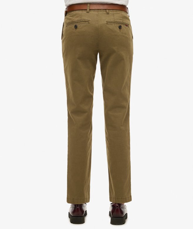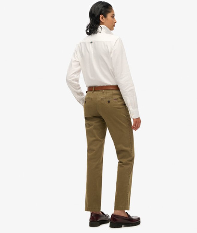Middelhoge taille Rechte pijpen Twee voorzakken Twee achterzakken met knopen Riemlussen Knoop- en ritssluiting Kleine Superdry-label op de achterzak Onze chino met halfhoge taille, een must-have voor casual tot smart-casual kleding, is de perfecte manier om je stijl op een ingetogen manier naar een hoger niveau te tillen.