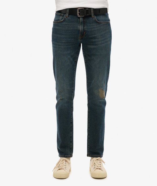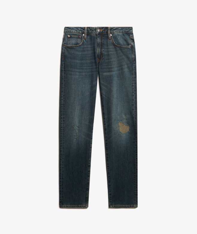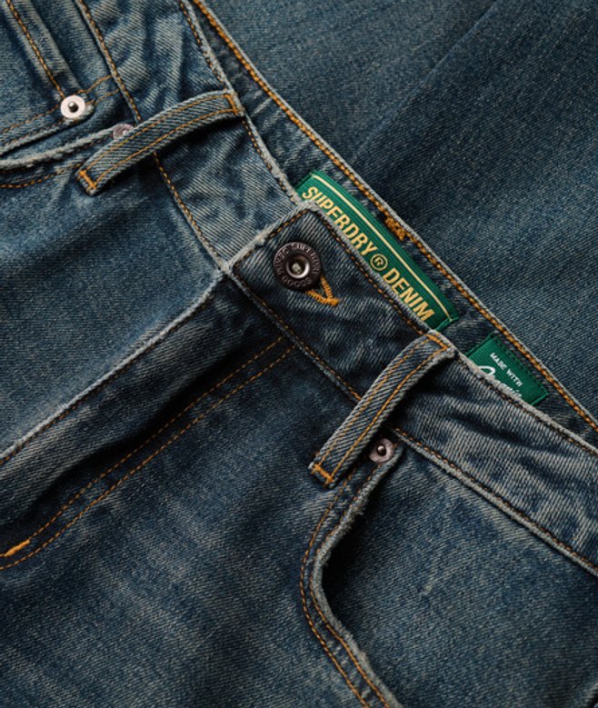 Knoopsluiting met ritssluiting Riemlussen Klassiek ontwerp met vijf zakken Verweerde details Metalen details met merklogo Vintage Superdry-patch Denim begon als westerse werkkleding en is nu een essentieel onderdeel van de vintagemode.