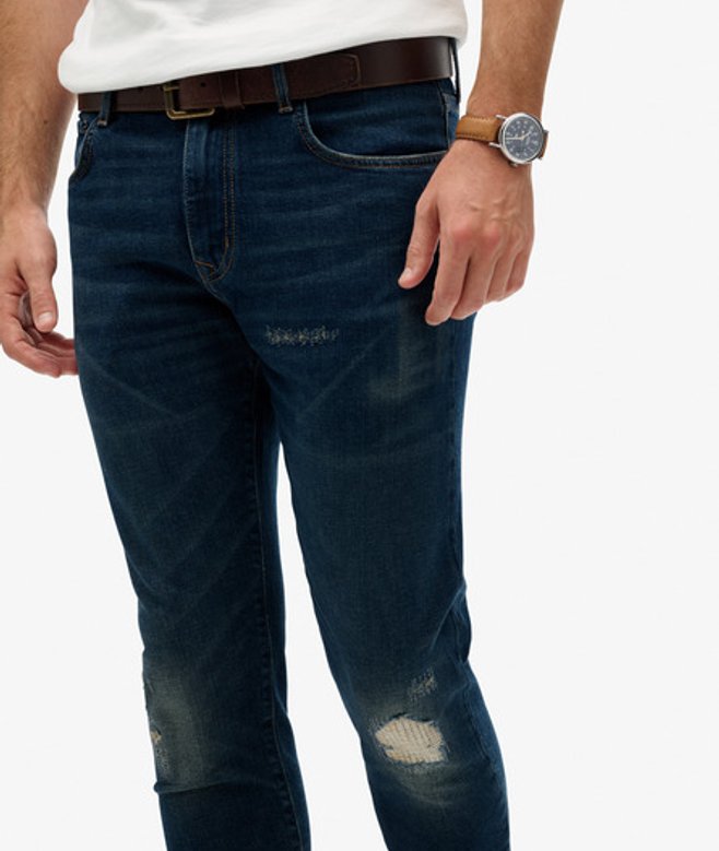 Knoopsluiting met ritssluiting Riemlussen Klassiek ontwerp met vijf zakken Verweerde details Metalen details met merklogo Vintage Superdry-patch Denim begon als westerse werkkleding en is nu een essentieel onderdeel van de vintagemode.