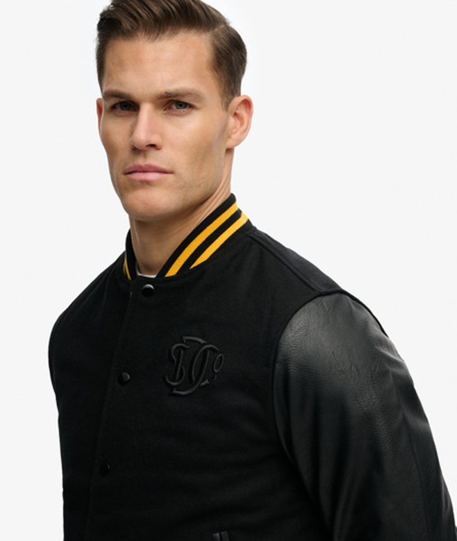 Kies je gebruikelijke maat Geribbelde boorden met drukknoopsluiting Twee buitenzakken en één binnenzak met drukknoopsluiting Mouwen van imitatieleer met een gewatteerde binnenvoering Geborduurd logo op de borst Ons klassieke Varsity-bomberjack is een absolute must voor de trendsetters.
