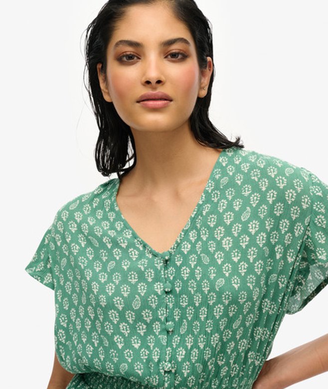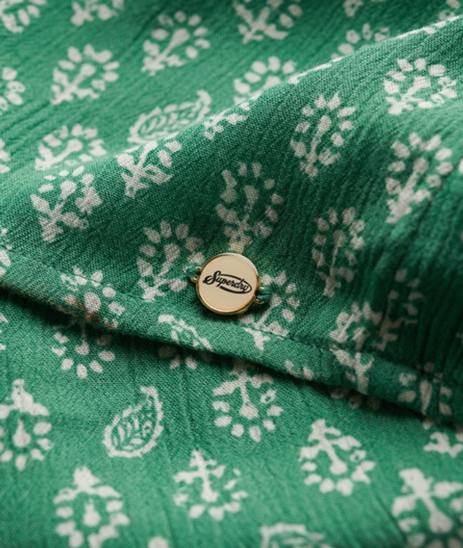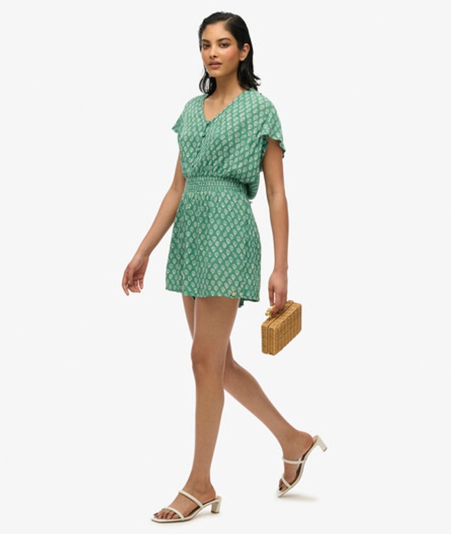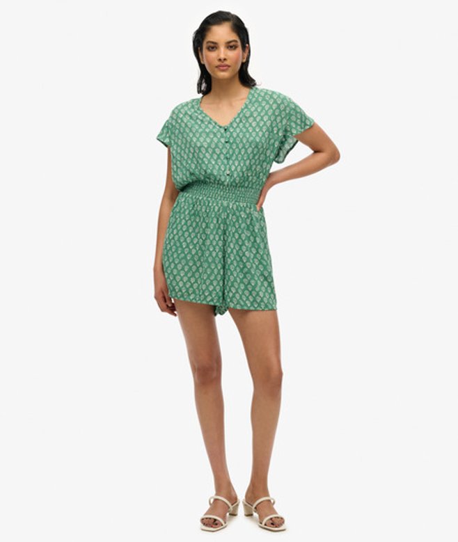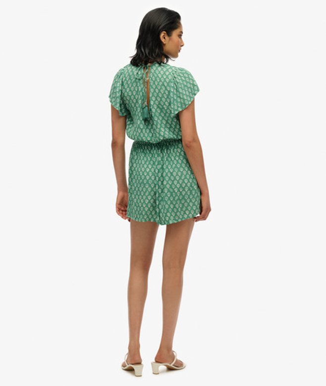 Kies je gebruikelijke maat V-hals en open rug Knoopsluiting en elastische taille Striksluiting aan de achterkant met kwastjes Kenmerkend metalen label op de pijp Ben je uitgekeken op je zomerjurken? Breng daar verandering in met onze playsuit met korte mouwen, gemaakt van een geweven gekreukt materiaal voor een heerlijk zomers gevoel.