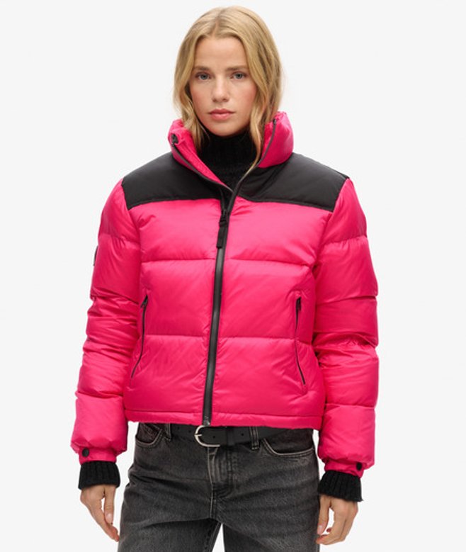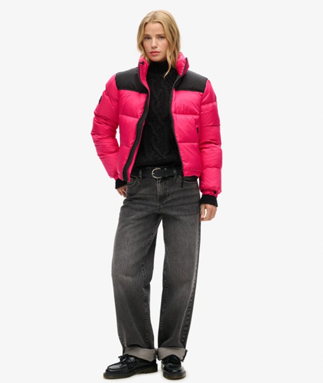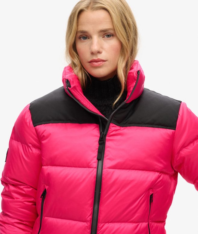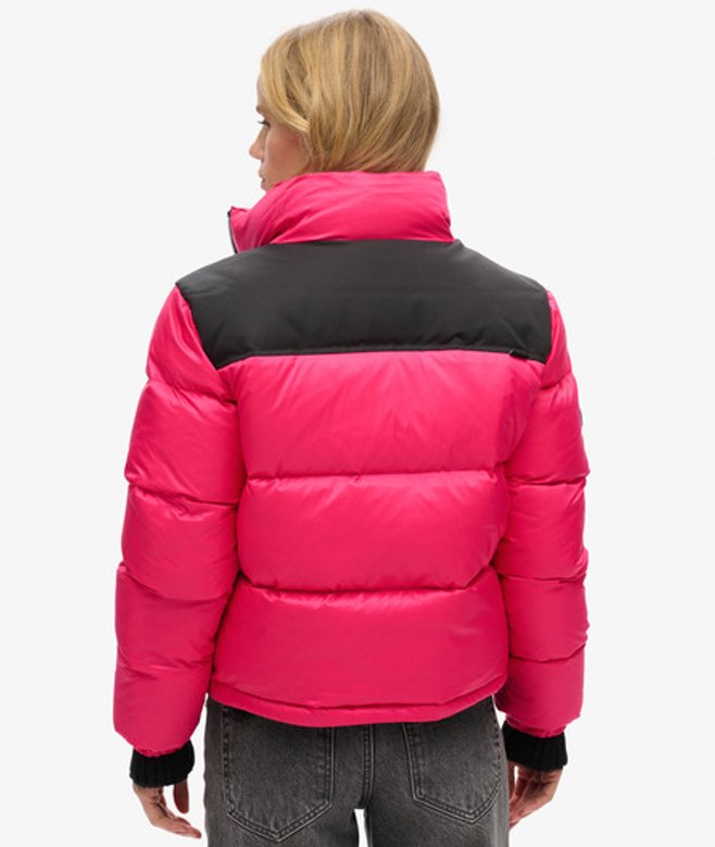 Ritssluiting Twee voorzakken met rits Pufferstijl Inzetstukken Elastisch trekkoord in de zoom Elastische manchetten met drukknopen Kenmerkend logolabel Eendendonsvulling Superdry is houder van het 'Responsible Down Standard'-certificaat voor verantwoord dons, wat bevestigt dat wij dons inkopen met respect voor het welzijn van dieren.
