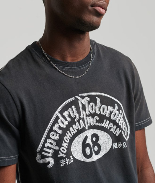 Het bikerthema speelt een vooraanstaande rol in onze geschiedenis en het vintage black van dit T-shirt past perfect bij dit logo met verweerd effect.