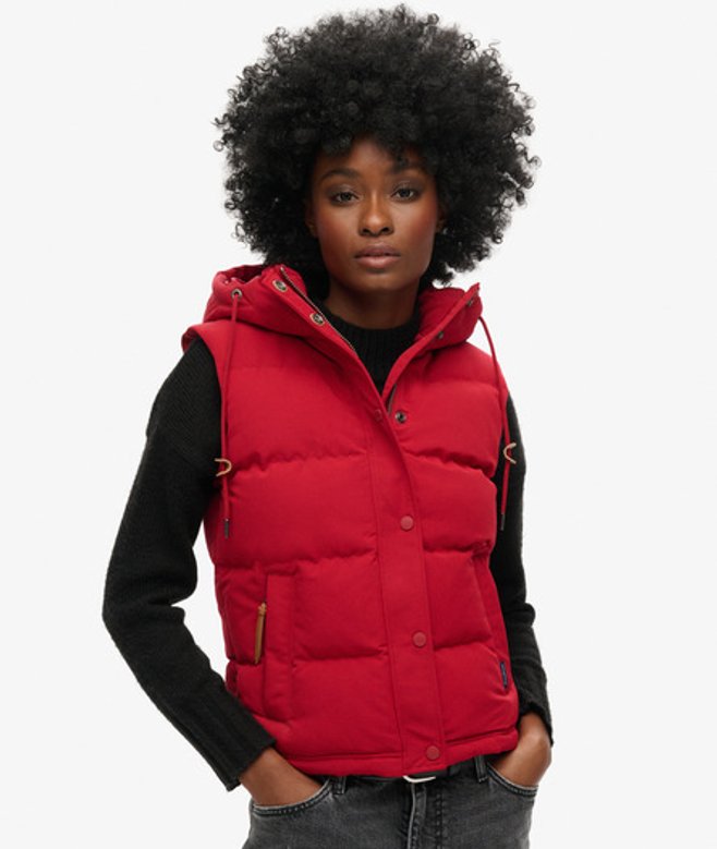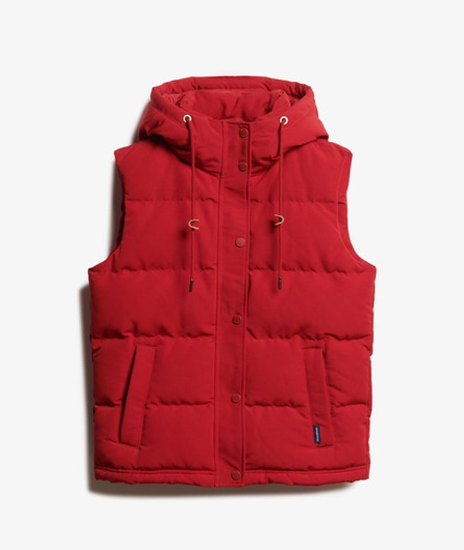 The Everest Hooded Puffer Gilet features a drawstring adjustable hood, two pockets and padding made from recycled bottles.