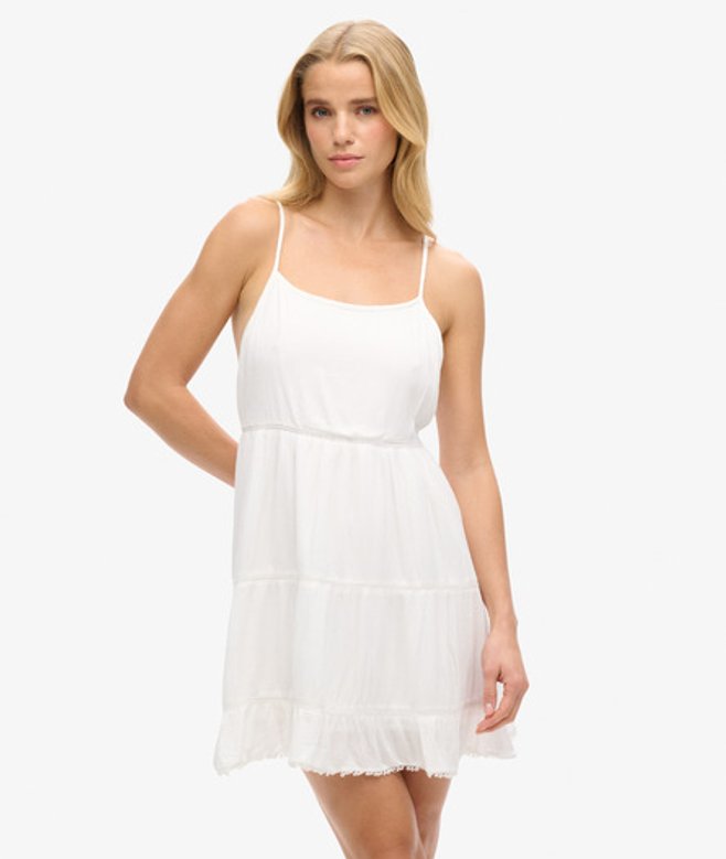 Go for your normal size Adjustable spaghetti straps Two invisible side pockets Lace detailing Self-tie back with beaded tassels Embroidered Superdry logo
