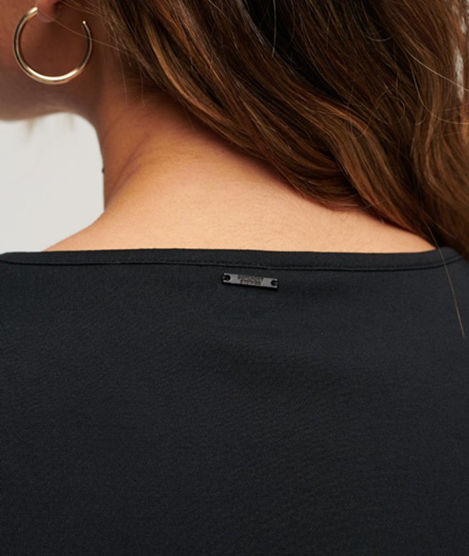 Slim fit - designed to fit closer to the body for a more tailored look Bodycon style Mini length V-Neck Long, flare sleeves Metal Superdry tab