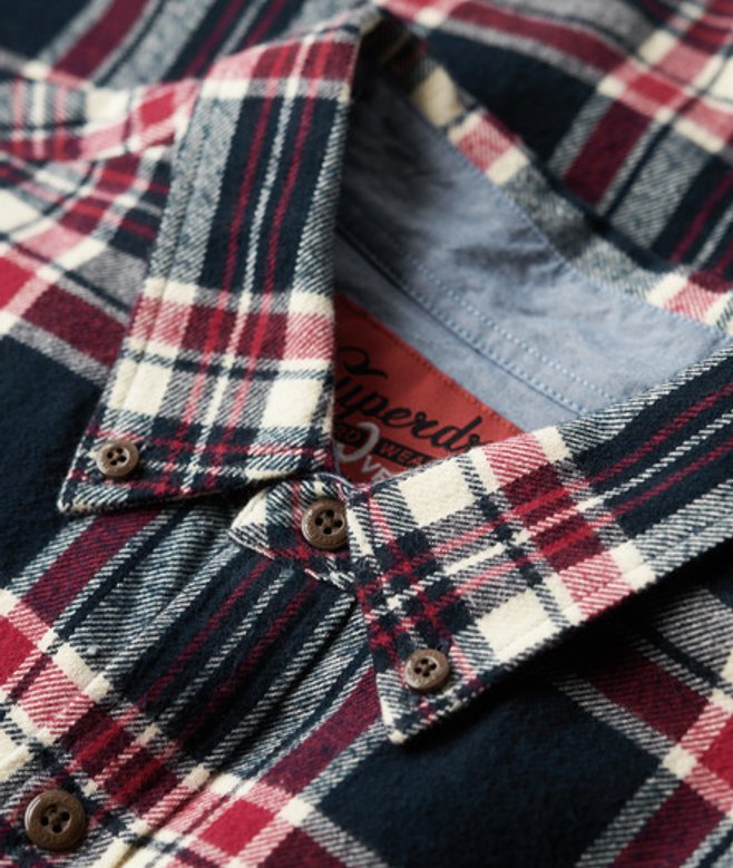 Go for your normal size Brushed cotton twill fabric Button-down collar Button fastening Long sleeves Button cuffs Chest pocket Twin back pleats Hanging loop Signature Superdry patch on pocket Branded buttons Logo patch behind lower placket