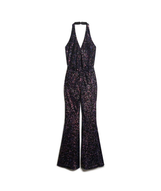 Slim fit - designed to fit closer to the body for a more tailored look Halter neck Button fastening Flared leg All over sequin Fully lined Elasticated waist