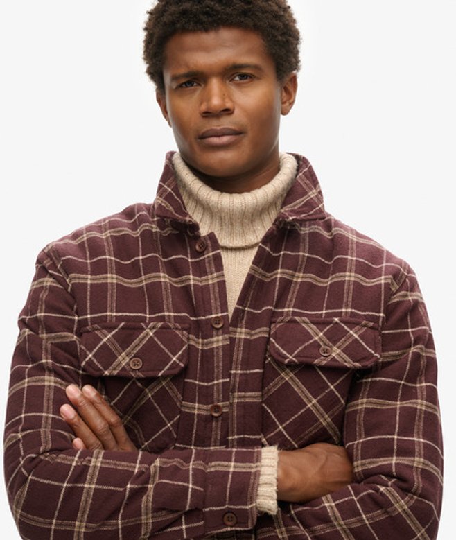 Go for your normal size Check design Standard collar Button fastening Button up cuffs Two chest button pockets Two side pockets Padded lining Signature Superdry patch