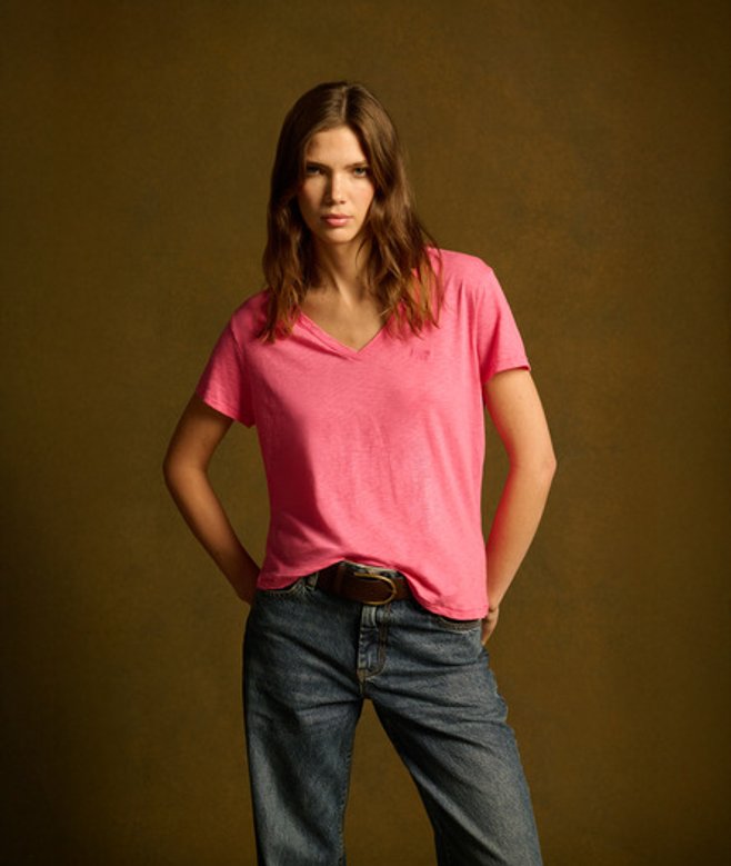 Go for your normal size V-Neck Short sleeves with unfinished hems Embroidered logo Back seam Signature Superdry logo badge