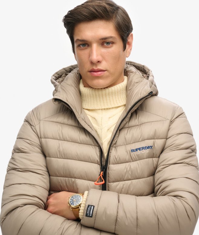 Slim fit - designed to fit closer to the body for a more tailored look Puffer design Hood with bungee cord adjustment Zip fastening Two external zip pockets Internal mesh pocket Bungee cord hem Elasticated cuffs Embroidered Superdry logo