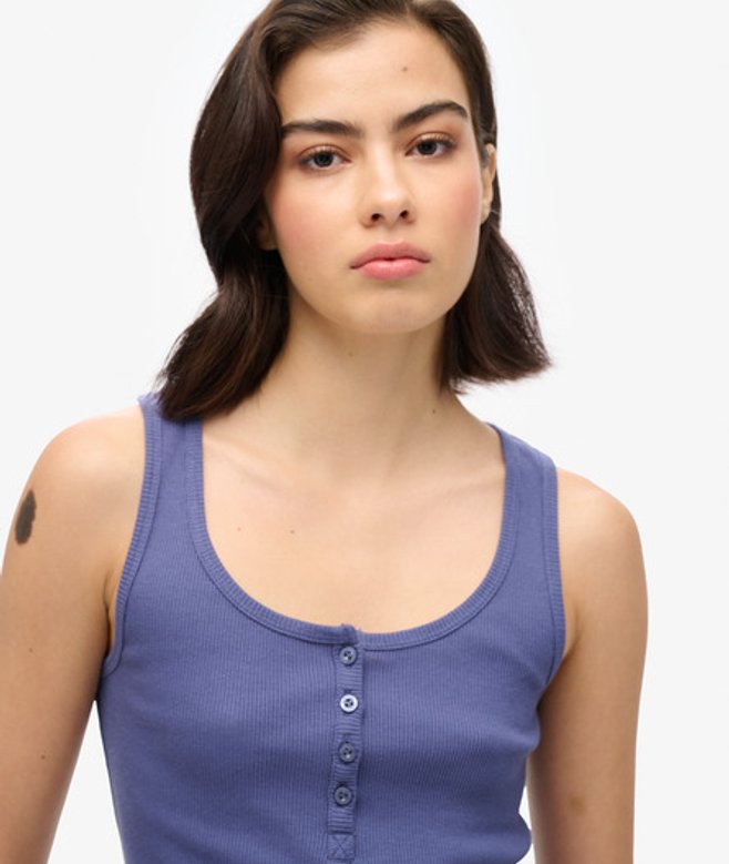 So easy to dress up or down, what's not to love? Slim fit - designed to fit closer to the body for a more tailored look Part of the Athletic Essentials Collection Ribbed material Scoop neck Sleeveless Button fastening Superdry tab UK 6-8, US 2-4, EU 34-36 UK 10-12, US 6-8, EU 38-40 UK 14-16, US 10-12, EU 42-44