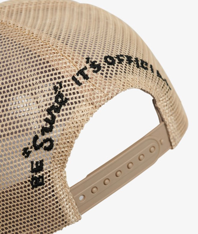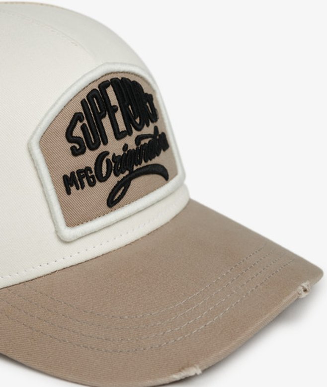Classic trucker design Mesh back panel Snap fastening Distressed curved peak Two colour design Superdry branding 'Be sure it's official' embroidery across back
